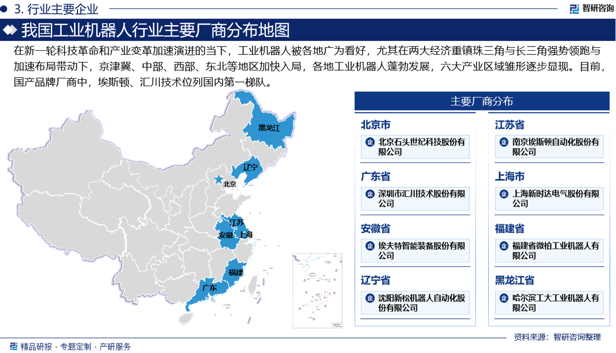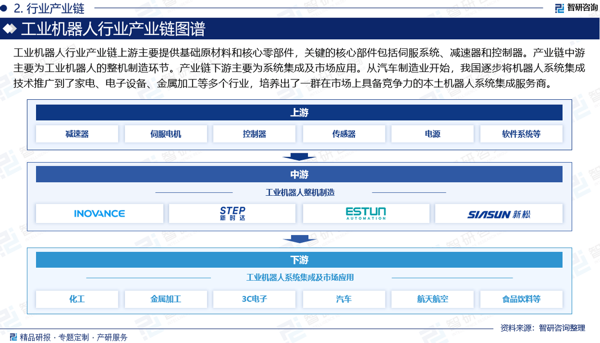 3:演讲焦点数据基于智研团队严酷的数据采集、筛选、加工、阐发系统以及自从测算模子,确保统计数据的精确靠得住。 此外,我们还出格关心了全球范畴内的行业领先企业,通过对比阐发它们的运营策略、市场结构以及立异能力,为业界读者供给了贵重的行业洞察取运营。 财产链下逛次要为系统集成及市场使用,是我国工业机械人财产链中最早取得进展的部门,为鞭策工业机械人的本土化使用阐扬了主要感化。从汽车制制业起头,我国逐渐将机械人系统集成手艺推广到了家电、电子设备、金属加工等多个行业,培育出了一群正在市场上具备合作力的本土机械人系统集成办事商,例如埃斯顿、新松机械人和汇川手艺等。 智研征询做为中国财产征询范畴带领品牌,以“用消息驱动财产成长,为企业投资决策赋能”为品牌。公司融合定量阐发取定性阐发方式,用自从研发算法,连系行业交叉大数据,通过多元化阐发,挖掘定量数据背后根因,分解定性内容背后逻辑,审慎地预测行业将来成长趋向,为客户供给专业的行业阐发、市场研究、数据洞察、计谋征询及相关处理方案,帮力客户提拔认知程度、盈利能力和分析合作力。次要办事包含精操行研演讲、专项定制、月度专题、可研演讲、贸易打算书、财产规划等。供给周报/月报/季报/年报等按期演讲和定制数据,内容涵盖政策监测、企业动态、行业数据、产物价钱变化、投融资概览、市场机缘及风险阐发等。 2:除一手调研消息和数据外,国度统计局、中国海关、行业协会、上市公司公开演讲(招股仿单、让渡仿单、年报、问询演讲等)等权势巨子数据源亦配合形成本演讲的数据来历。一手材料来历于研究团队对行业内沉点企业获取的一手消息数据,次要采访对象有企业高管、行业专家、手艺担任人、下旅客户、分销商、代办署理商、经销商以及上逛原料供应商等;二手材料来历次要包罗全球范畴相关行业旧事、公司年报、非盈利性组织、行业协会、机构及第三方数据库等。